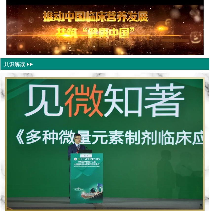 视频突出了共识给临床带来的意义。北京医院朱明炜教授指出:对于长期接受肠外营养的外科患者,常规补充微量元素是十分必要的,对于术后康复具有积极意义。上海市儿童医学中心洪莉教授指出:儿科患者应使用不含铬的、婴幼儿和儿童的专用制剂。为了便于推广应用,共识提出十二条明确推荐意见。北京协和医院康维明教授指出:共识汇聚了近几年微量元素的临床研究成果,带动了微量元素在营养治疗中的快速发展。