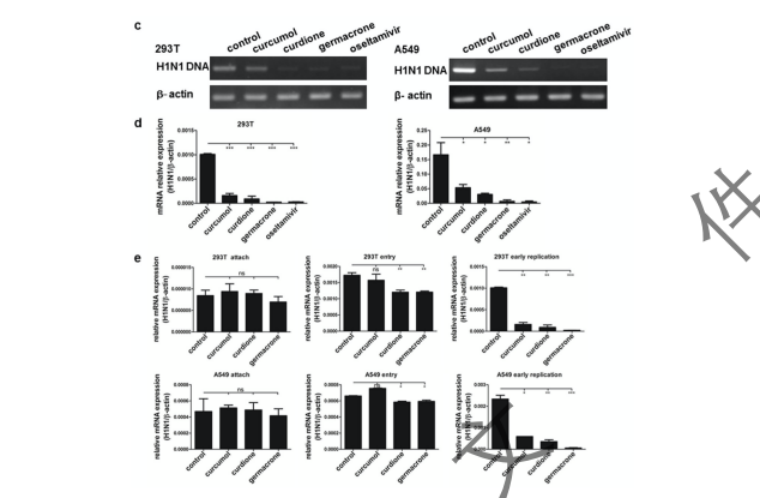 抗病毒作用机制明确。试验发现莪术酮、吉马酮、莪术二酮抑制甲型H1N1流感病毒的复制,减少病毒蛋白表达和RNA合成,减轻甲型H1N1流感病毒诱导的肺损伤和减少血清及全血细胞中的病毒负荷。其中吉马酮作用效果最好。
