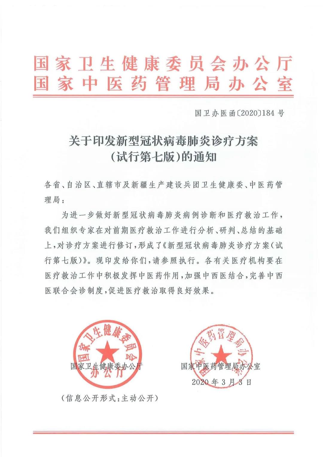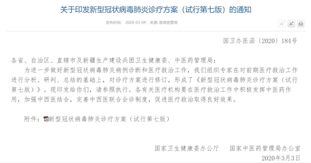 2020年3月4日,国家卫健委办公厅正式向各地卫健委下发《新型冠状病毒肺炎诊疗方案(试行第七版)》(以下简称“第七版”)。