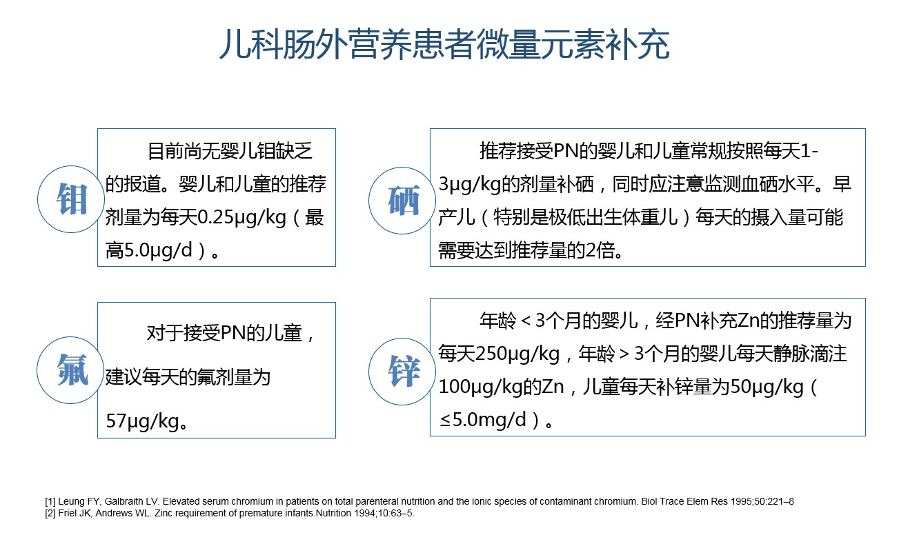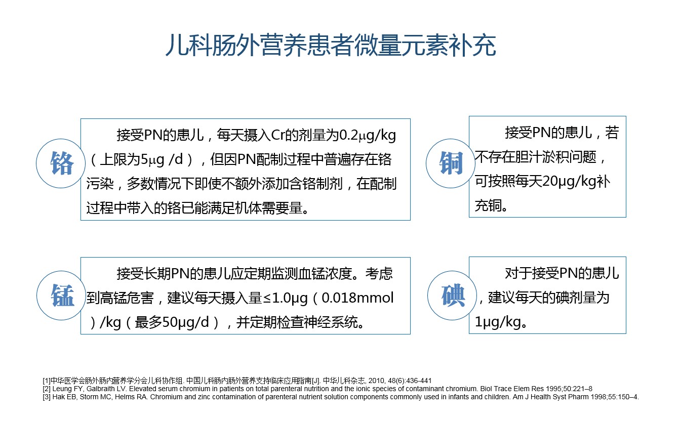 儿科患者因营养状况、伴随疾病、生长阶段的不同而产生不同的营养需求,肠外营养时微量元素的补充剂量与成人有很大差别。建议使用儿童型多种微量元素制剂,补充6种微量元素(如多种微量元素注射液(Ⅰ))。