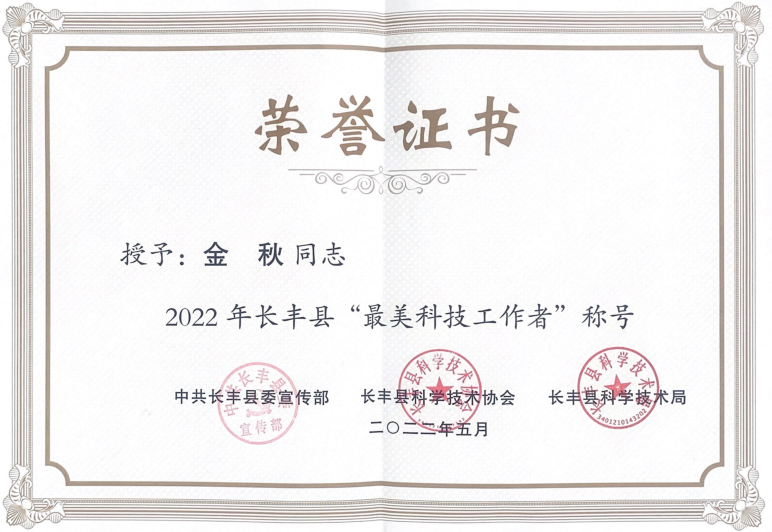 2022年5月,研发中心总经理金秋博士被长丰县县委宣传部、县科协、县科学技术局(长科协【2022】24号)共同授予“最美科技工作者”荣誉称号。在这奋进与拼搏,成就与荣耀交织里是我们未来人的奉献与付出,是我们未来人忠诚与执着的体现。希望公司广大员工以“最美科技工作者”金秋同志为榜样,开拓创新,兢兢业业做好各项工作,以饱满的精神状态和昂扬的奋斗姿态踏上新征程,为公司的蓬勃发展贡献智慧和力量。