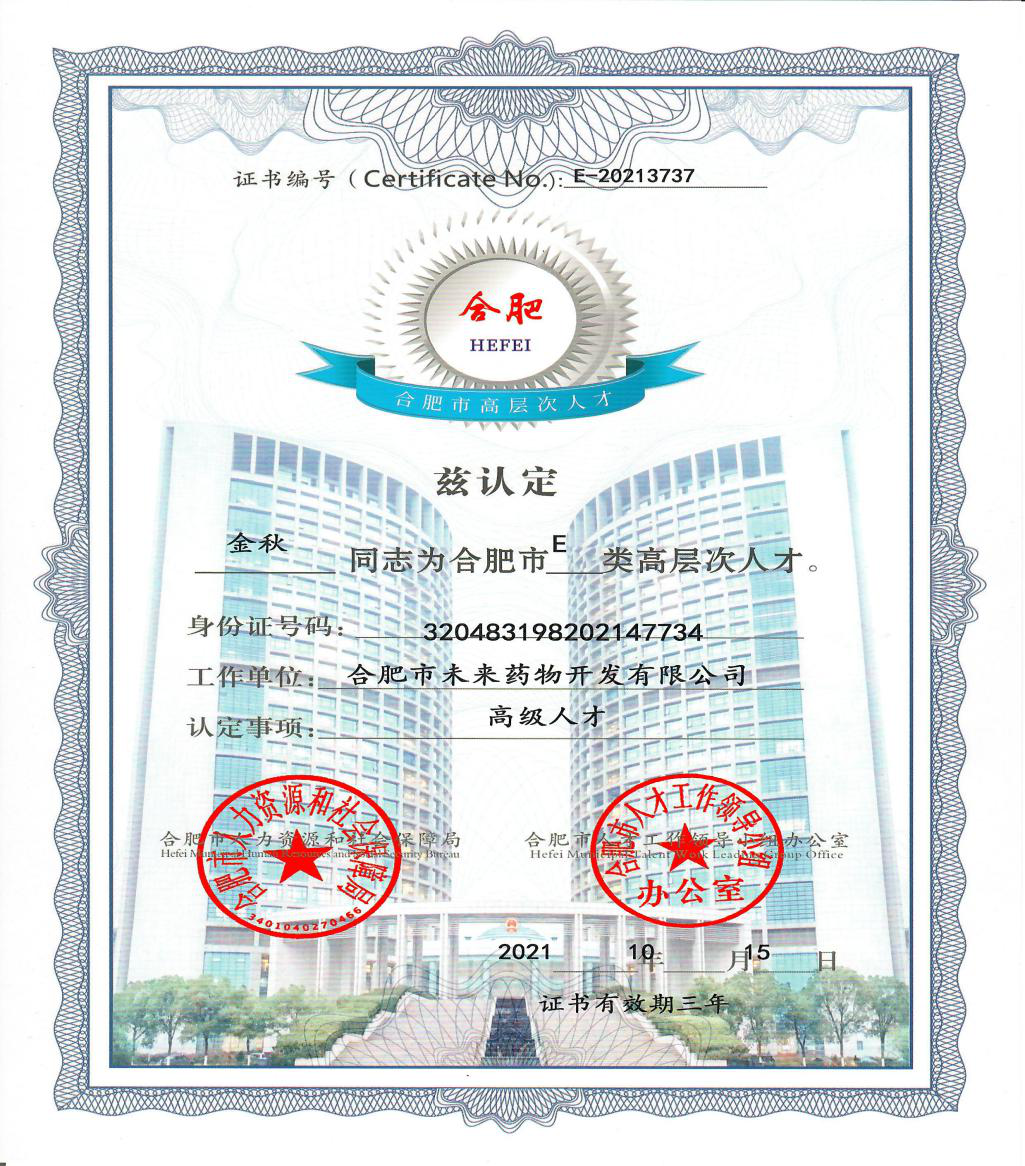 金秋博士在科技工作上敢于创新,敢于实践,立足已有的独家品种,根据临床需求,进行改良创新。并带领团队主持多个仿制药的研究项目。2021年10月,被合肥市人力资源和社会保障局及合肥市人才工作领导小组办公室认定为合肥市高层次人才。